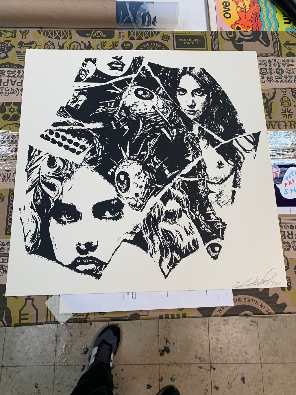 Printed as an 18 × 18 inch hand-pulled serigraph on archival French Paper, DISINTEGRATION maintains a strong physical presence. The choice of a single color reinforces the starkness of the image, while the analog screen-printing process contrasts the digital themes embedded in the work.